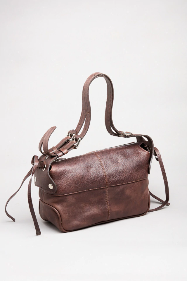 Shoulder bag, acceso con cierre niquelado a tono, con moños laterales, tira doble con hebillas para cambiar el largo, y recortes.