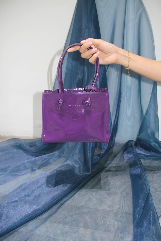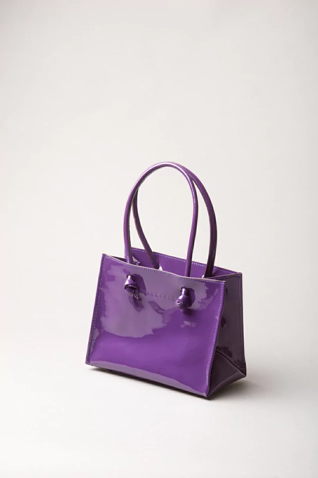 Carterita estilo mini tote, 100% cuero vacuno charolado color violeta