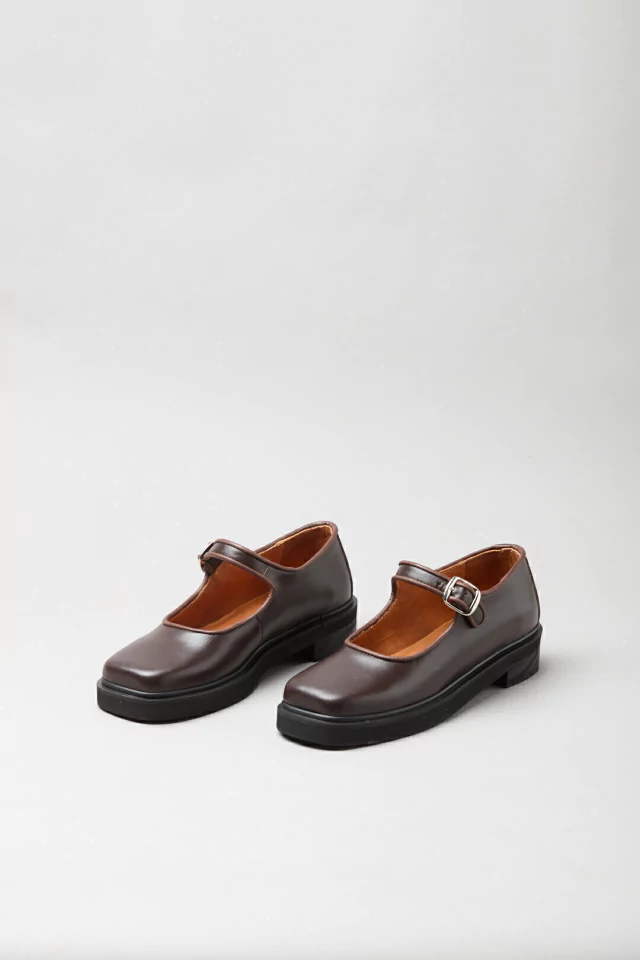 Zapato mary jane punta cuadrada, 100% cuero color marrón oscuro liso, alto brillo.