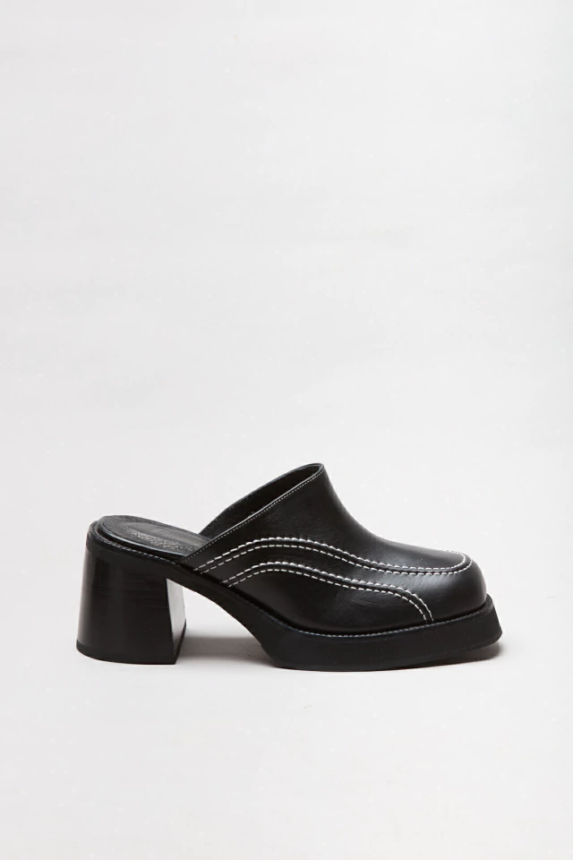 Sueco 100% de cuero liso color negro, con recortes y costuras a contratono en blanco.